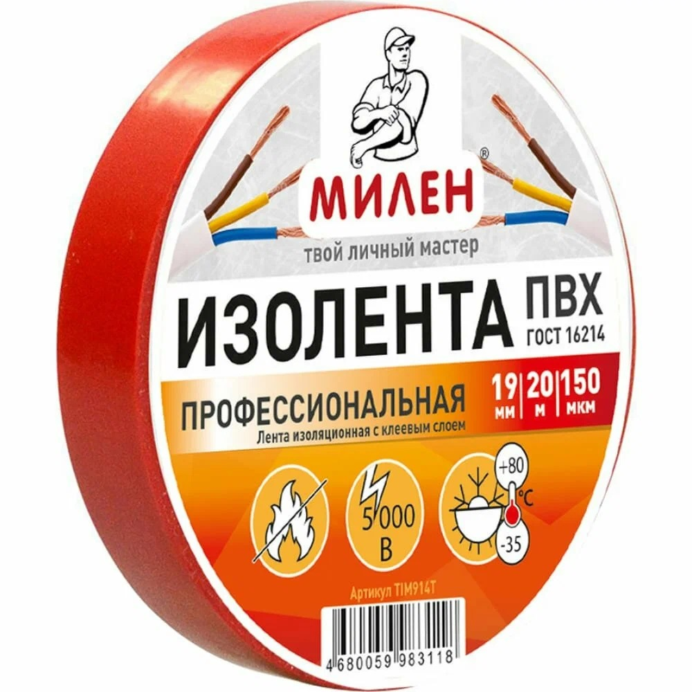 Изолента Милен ПВХ, 19 мм х 20 м, 150 мкм, 5 Кв, красная. - лента профессионального качества, используется для изоляции при электротехнических работах, жгутирования проводов и кабельных соединений. Изолента обладает высокой прочностью, эластичностью, морозостойкостью, выдерживает напряжение пробоя до 5 Кв, не подлежит горению. Соответствует требованиям ГОСТ 16214-86.