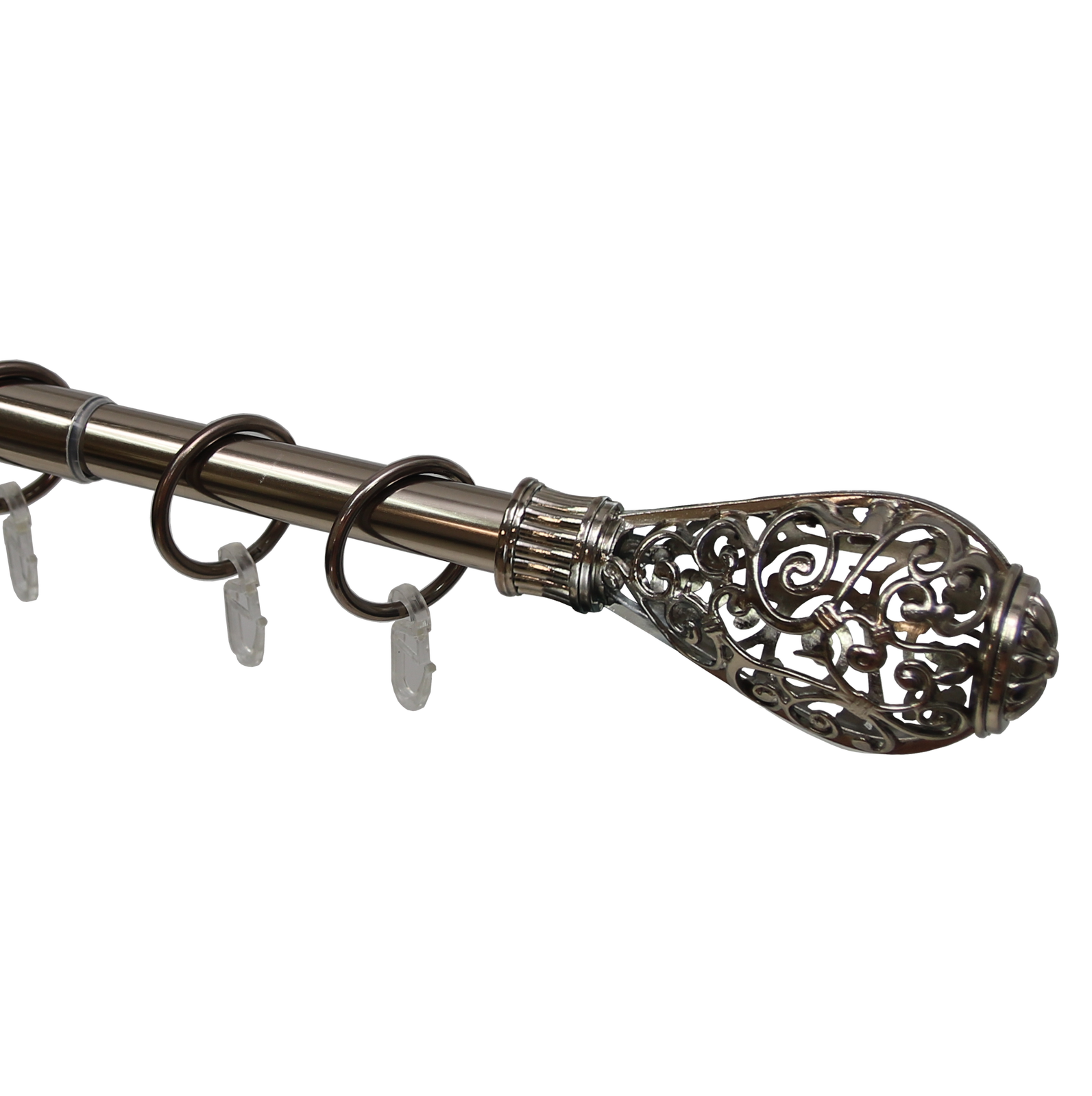 Данный карниз практичное и стильное решение для подвеса штор в один слой, сделан из долговечного и прочного материала. Телескопическая штанга позволяет подогнать длину карниза под размеры оконного проема, регулируется в диапазоне от 160 до 320 см. Карниз состоит из 2 трубок разного диаметра, вставленных друг в друга. Диаметр большей трубки 19 мм, диаметр меньшей трубки — 16 мм. За счет внутреннего поворотного механизма меньшая по диаметру штанга может выдвигаться из большей или задвигаться на всю свою длину.