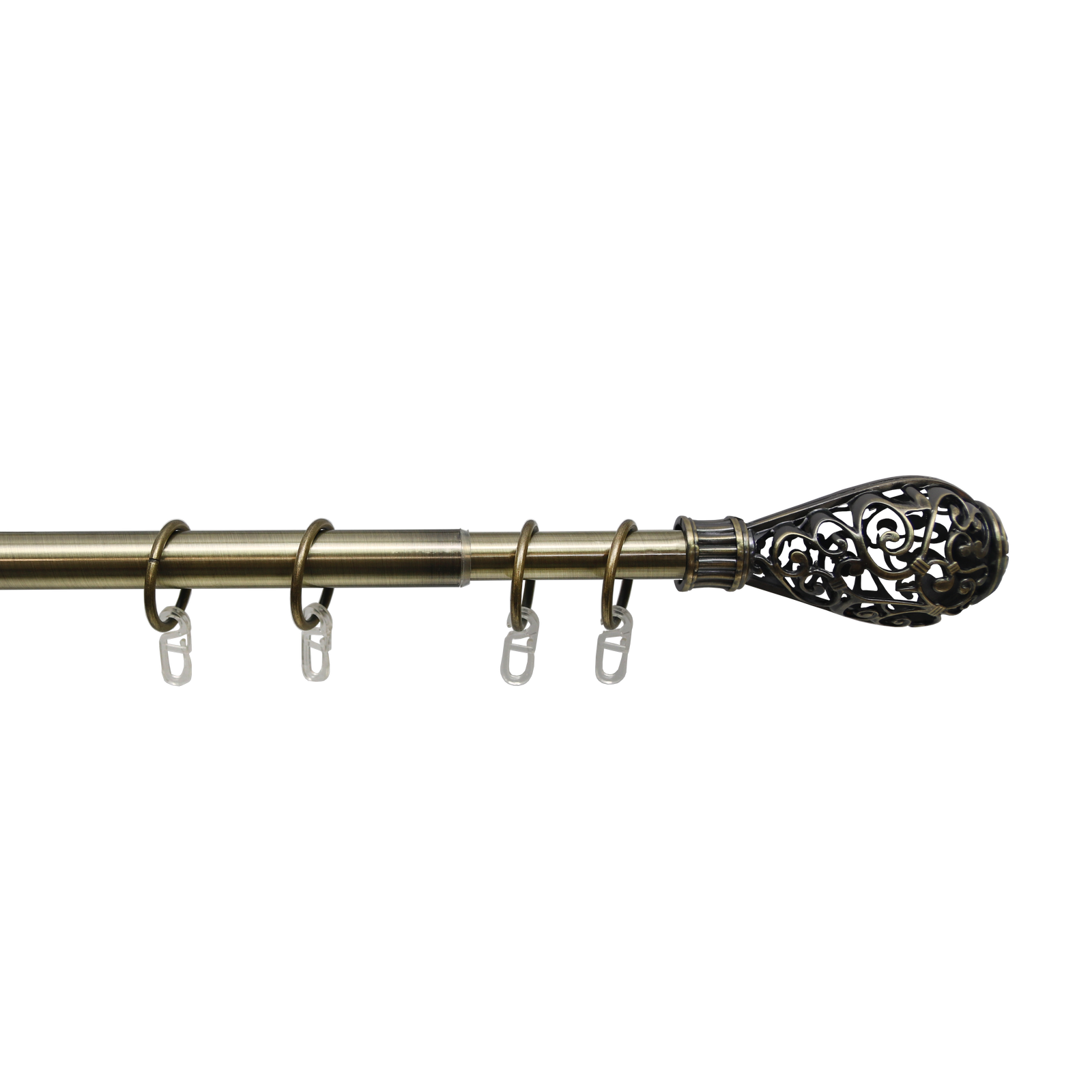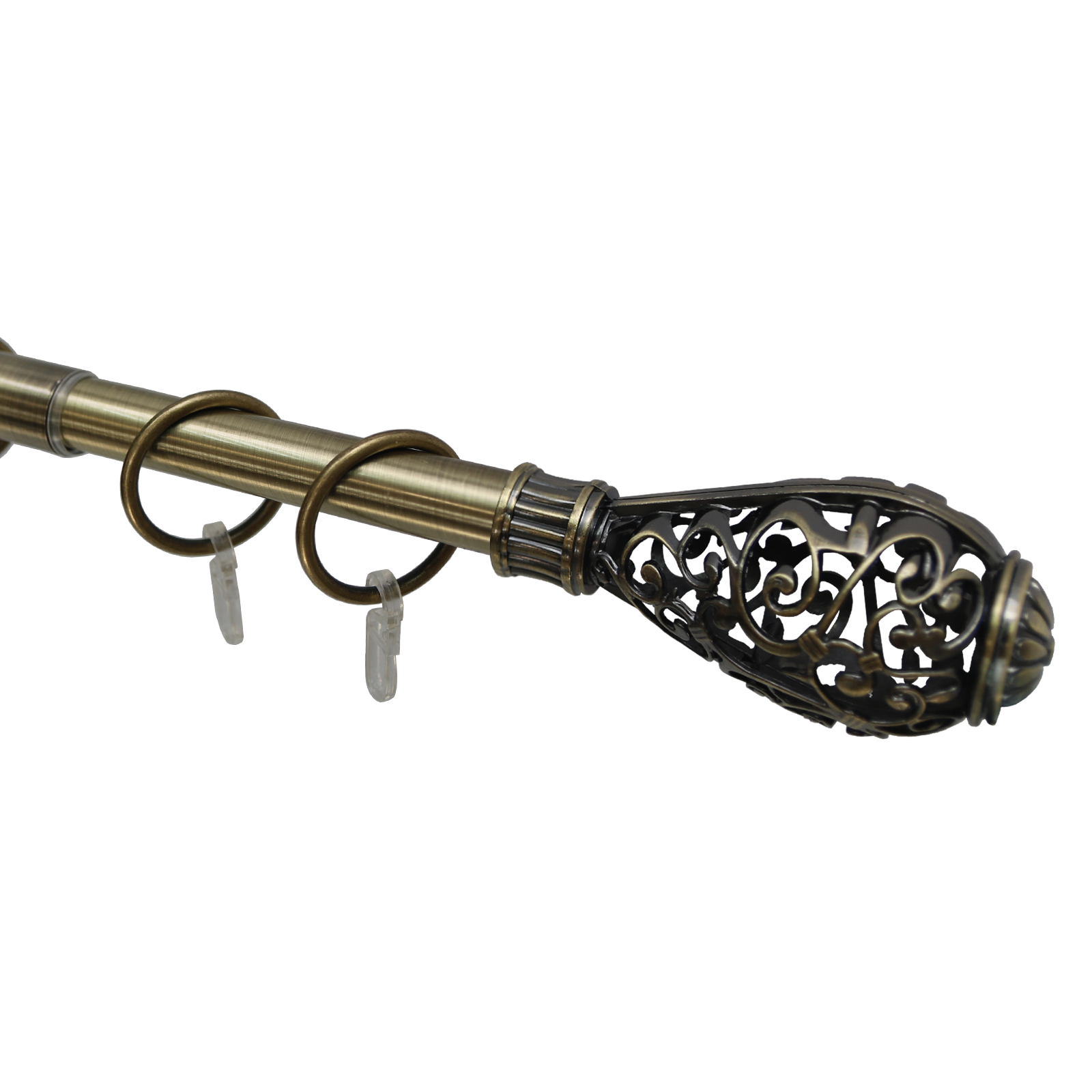 Данный карниз практичное и стильное решение для подвеса штор в один слой, сделан из долговечного и прочного материала. Телескопическая штанга позволяет подогнать длину карниза под размеры оконного проема, регулируется в диапазоне от 160 до 320 см. Карниз состоит из 2 трубок разного диаметра, вставленных друг в друга. Диаметр большей трубки 19 мм, диаметр меньшей трубки — 16 мм. За счет внутреннего поворотного механизма меньшая по диаметру штанга может выдвигаться из большей или задвигаться на всю свою длину.