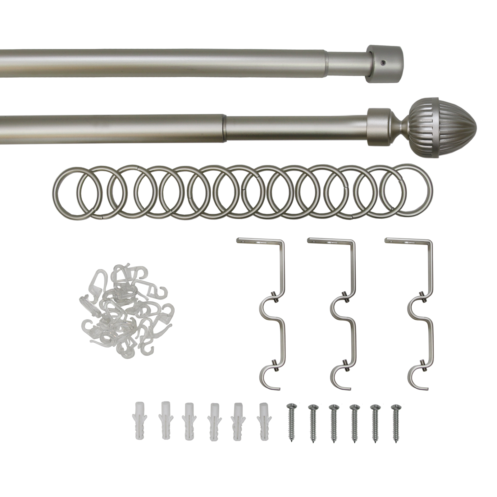 | Комплектация | 2 штанги, 2 наконечника, 2 заглушки, 3 двойных держателя для штанги, 64 кольца для крючка, 64 крючка |