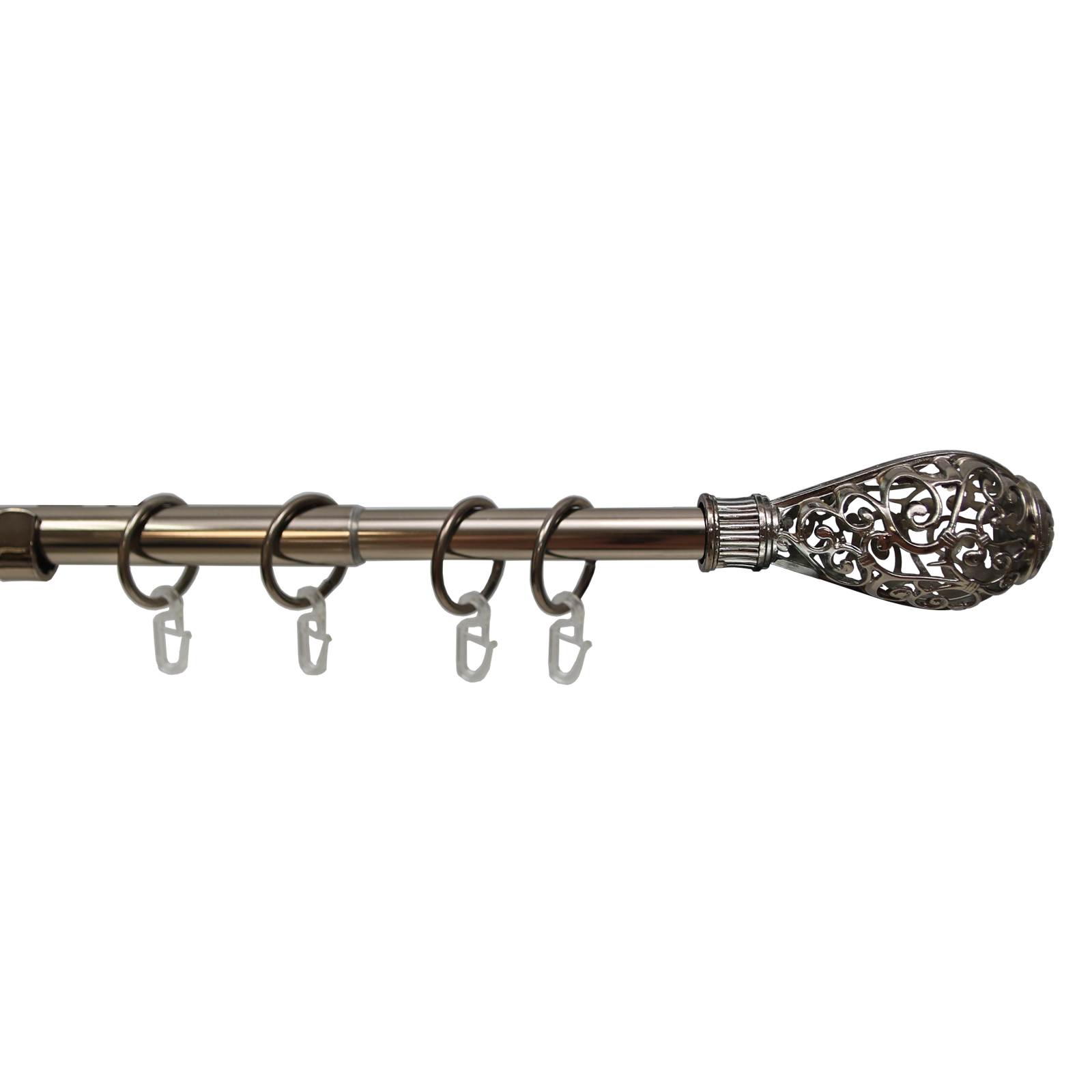 Данный карниз практичное и стильное решение для подвеса штор в один слой, сделан из долговечного и прочного материала. Телескопическая штанга позволяет подогнать длину карниза под размеры оконного проема, регулируется в диапазоне от 160 до 320 см. Карниз состоит из 2 трубок разного диаметра, вставленных друг в друга. Диаметр большей трубки 19 мм, диаметр меньшей трубки — 16 мм. За счет внутреннего поворотного механизма меньшая по диаметру штанга может выдвигаться из большей или задвигаться на всю свою длину.