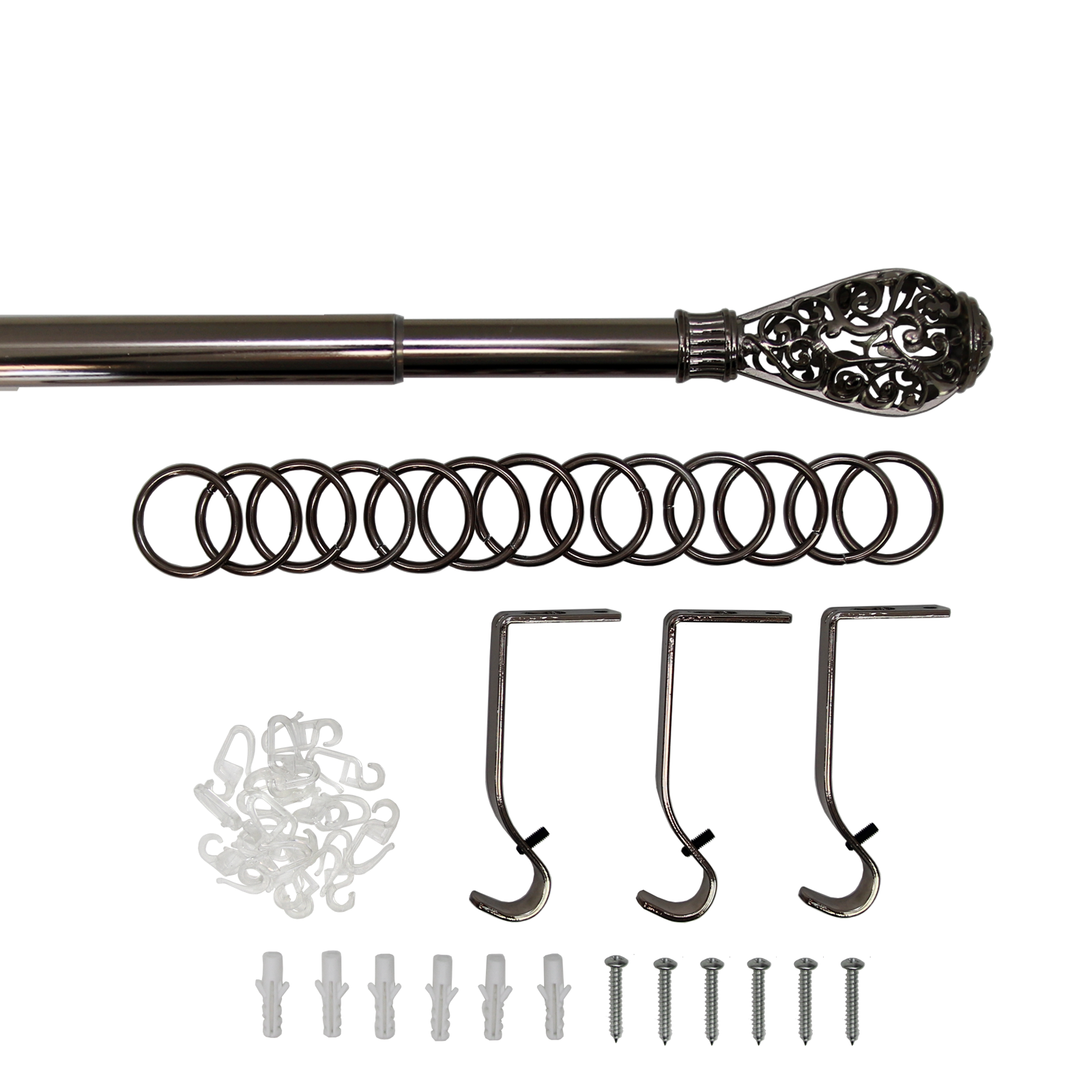 | Комплектация | 1 штанга, 2 наконечника, 3 держателя для штанги, 32 кольца для крючка, 32 крючка |